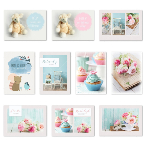 De set bestaat uit 10 stuks dubbele wenskaarten van 10x15 cm
