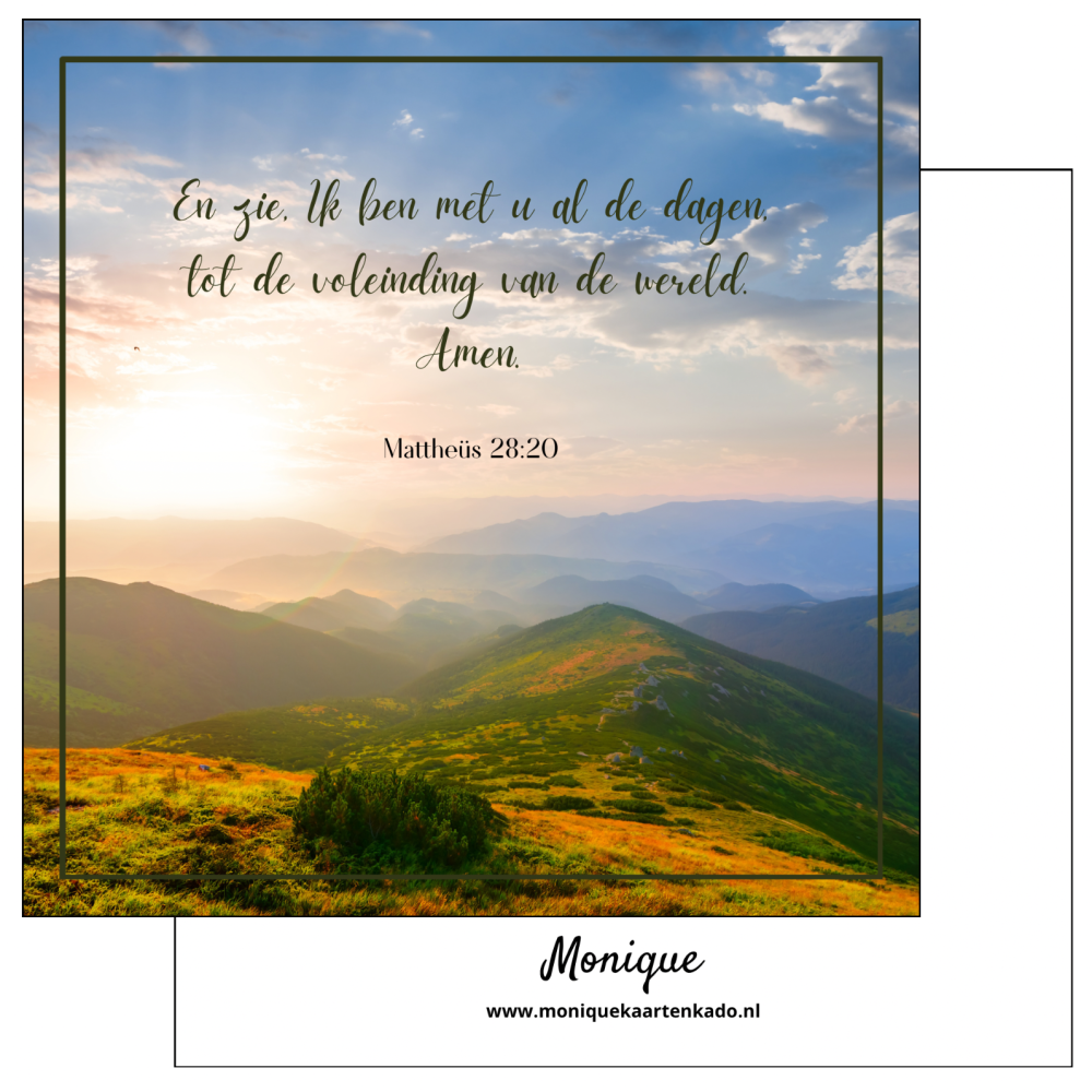 Bemoedigend en troostvol: deze christelijke wenskaart bevat de bekende Bijbeltekst uit Mattheüs 28:20: