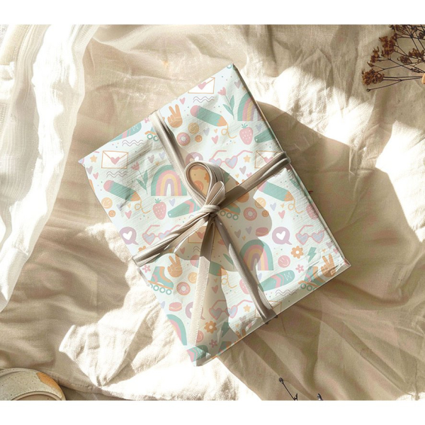 Een kleurrijk en vrolijk inpakpapiertje. Je pakt je cadeautje feestelijk in met dit kadopapier.