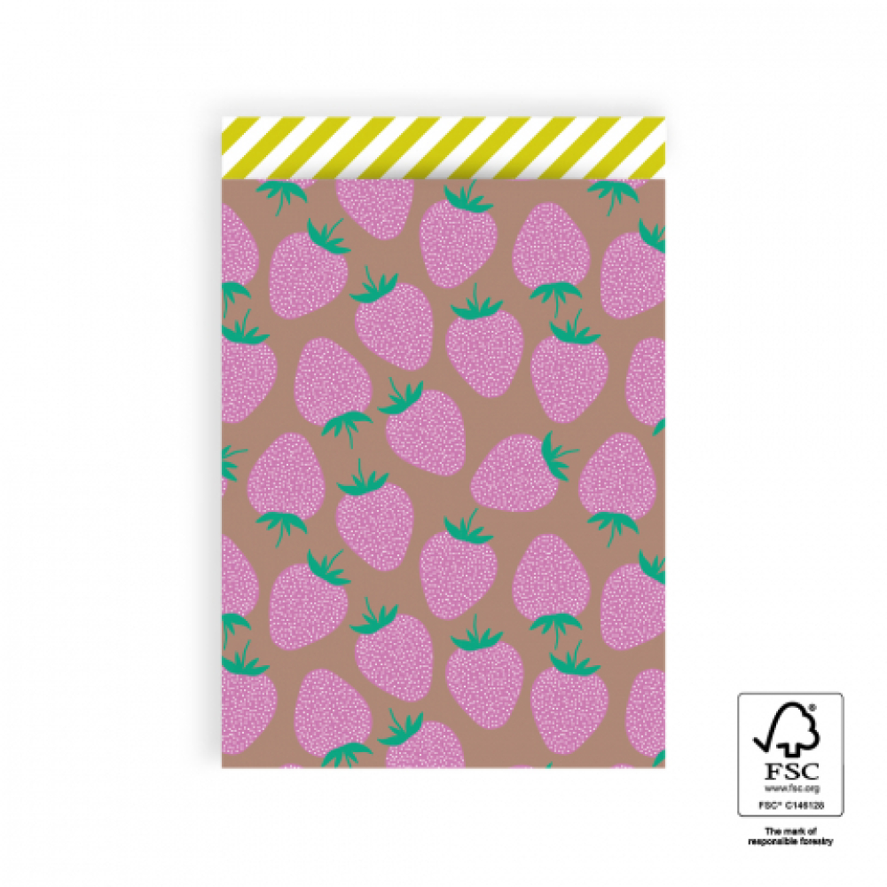 Het vrolijke dessin met aardbeien in roze en groene details op een taupe achtergrond brengt de zomer naar jouw cadeau. De gele streep aan de binnenzijde voegt een vrolijke touch toe. Of je nu een verjaardag viert, een jubileum markeert, of gewoon iets liefs inpakt, deze zakjes voegen een zonnige sfeer toe.
