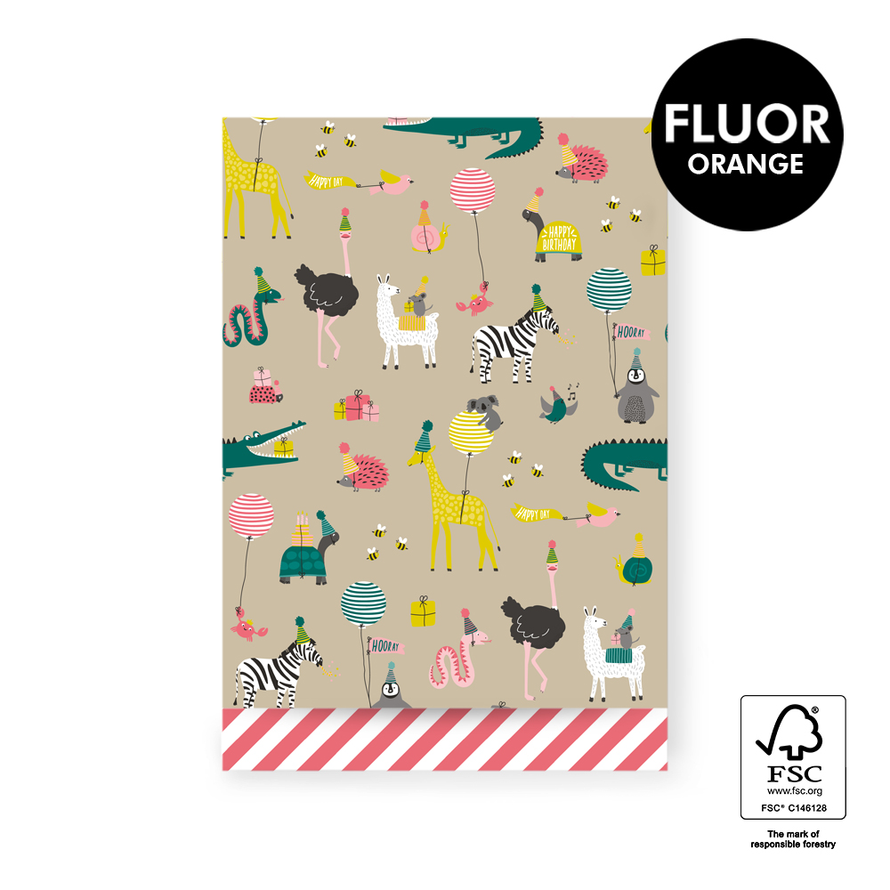 Wil je een feestelijke touch geven aan je cadeau? Kies dan voor dit vrolijke platte inpakzakje voor kinderen! Het zakje is versierd met feestelijke dieren die allemaal een feestje vieren met ballonnen, cadeautjes of een feesthoedje. De binnenzijde van het zakje heeft een fluor oranje streep voor een extra speels effect. Dit zakje is perfect voor het inpakken van cadeautjes voor verjaardagen of andere feestelijke gelegenheden. House of Products levert duurzame en FSC®-gecertificeerde producten, zodat je met een goed gevoel kunt feestvieren.