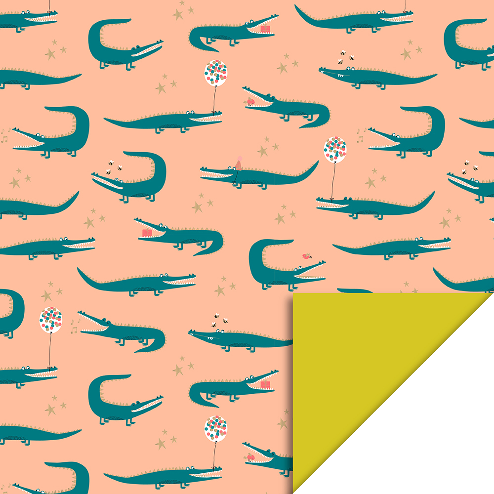 Een cadeauzakje met knalgroene krokodillen op een fris oranje ondergrond met een gele binnenzijde bedrukking. Humor staat centraal op dit papier en tovert absoluut een lach op elk gezicht.